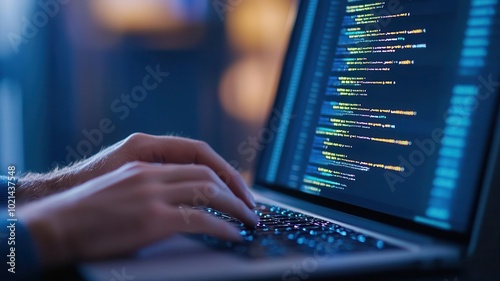 Wall mural a person is typing code on a laptop, with colorful lines of programming text displayed on the screen - Wall murals Wall mural a person is typing code on a laptop, with colorful lines of programming text displayed on the screen - Wall murals