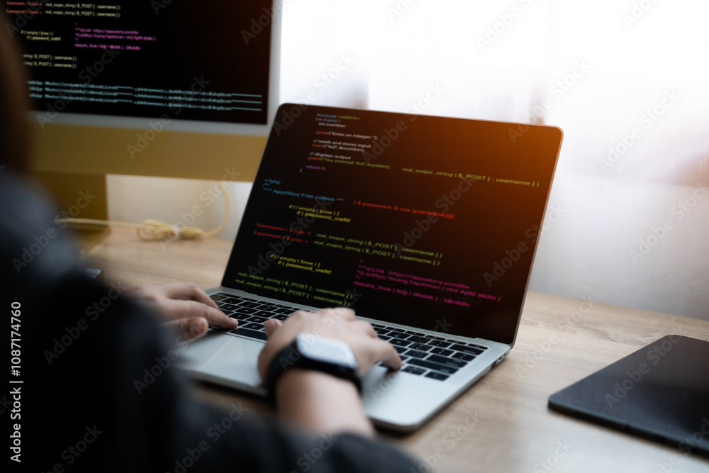 The watermark will not be included on Wall mural.: A person is typing on a laptop computer with a colorful screen - the laptop is open to a page with a