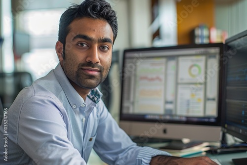Wall mural a person sitting in front of two computer monitors with a serious expression, possibly focused on wo