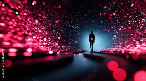Wall mural : A person standing in a futuristic data center, surrounded by glowing screens displaying information,