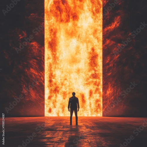 The watermark will not be included on Wall mural.: A person standing in front of a wall of fire, representing determination to pass through challenges