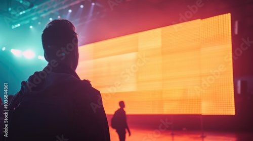 The watermark will not be included on Wall mural.: A person stands in front of a large screen with information displayed