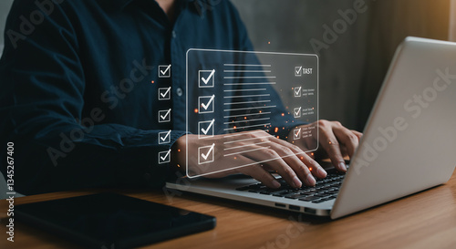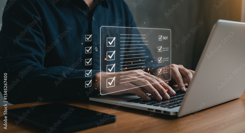 The watermark will not be included on Wall mural.: A person using a laptop with a digital checklist overlay and a smartphone on the table near it