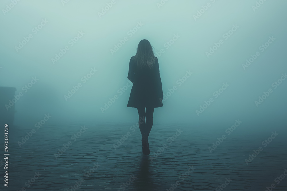 Wall mural a person walking through a foggy street where their outline is barely visible, creating an ethereal  - Wall murals Wall mural a person walking through a foggy street where their outline is barely visible, creating an ethereal - Wall murals