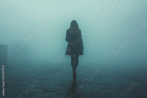 The watermark will not be included on Wall mural.: A person walking through a foggy street where their outline is barely visible, creating an ethereal