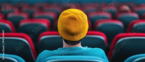 The watermark will not be included on Wall mural.: A person wearing a yellow beanie sits alone in a theater, surrounded by colorful empty seats, creati