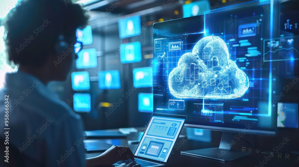 The watermark will not be included on Wall mural.: A person working on a laptop with a large monitor displaying a digital cloud symbol with various dat