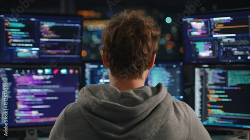 The watermark will not be included on Wall mural.: A personal computer with screens showing a software program and coding language interface is being w