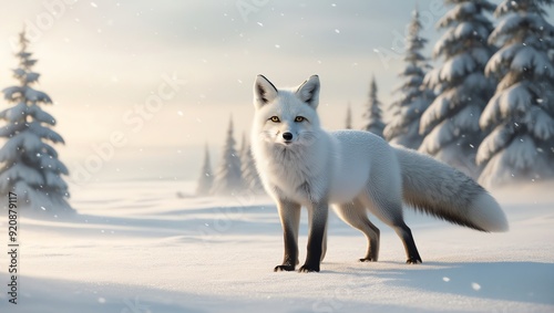 The watermark will not be included on Wall mural.: A picture of a white arctic fox standing in a snowy field with trees in the background -