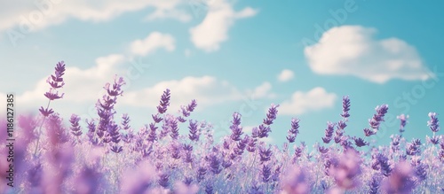 The watermark will not be included on Wall mural.: A picture of blooming lavender flowers in a field under a blue sky featuring a space for text select