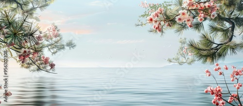 Wall mural a picturesque scene showing pine tree branches with flowers on one side and the sea on the other cre - Wall murals Wall mural a picturesque scene showing pine tree branches with flowers on one side and the sea on the other cre - Wall murals