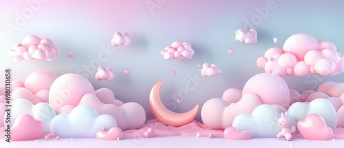 Wall mural a pink and white background with a large pink moon and many pink clouds. there is a rabbit in the bo - Wall murals Wall mural a pink and white background with a large pink moon and many pink clouds. there is a rabbit in the bo - Wall murals