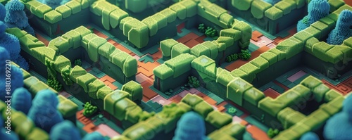 The watermark will not be included on Wall mural.: A pixel art rendition of a pixelated maze with winding paths and hidden corners, representing the ch