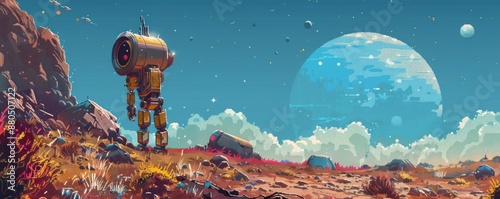 Wall mural a pixel art rendition of a retro-futuristic robot exploring a desolate planet, its pixelated form co - Wall murals Wall mural a pixel art rendition of a retro-futuristic robot exploring a desolate planet, its pixelated form co - Wall murals