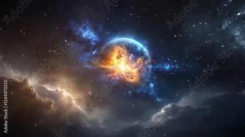 The watermark will not be included on Wall mural.: A planet exploding in space, surrounded by nebula clouds - the explosion is glowing with blue and ora
