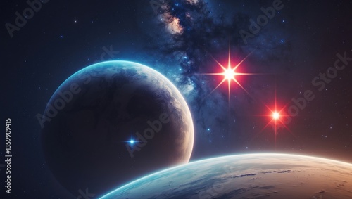 Wall mural a planet in a binary star system. deep space features blue and red stars. speculative science. - Wall murals Wall mural a planet in a binary star system. deep space features blue and red stars. speculative science. - Wall murals