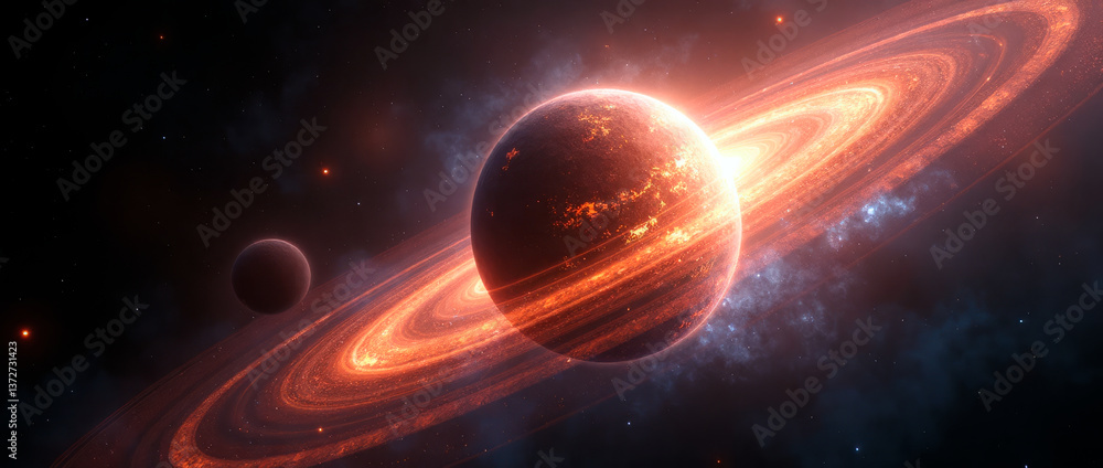 The watermark will not be included on Wall mural.: A planet with fiery rings glows under starlight in the depths of space -