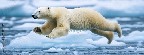 Wall mural a polar bear leaps between ice floes in the arctic ocean.