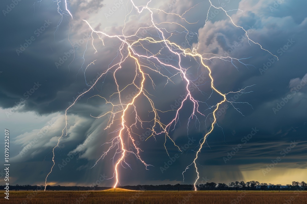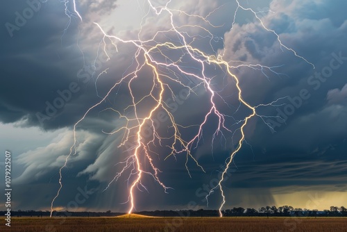 Wall mural a powerful lightning bolt strikes the ground in an open field below ominous clouds. - Wall murals Wall mural a powerful lightning bolt strikes the ground in an open field below ominous clouds. - Wall murals