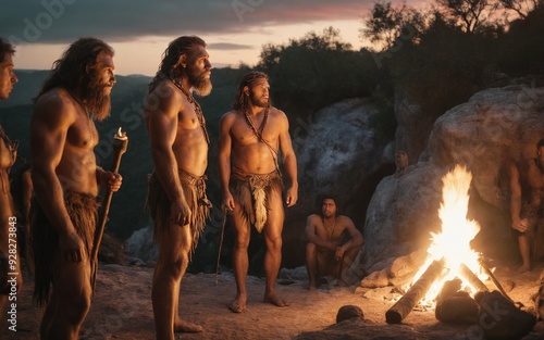 Wall mural a primitive tribe of ancient people in animal skins stands by a large fire in a cave. neanderthals.  - Wall murals Wall mural a primitive tribe of ancient people in animal skins stands by a large fire in a cave. neanderthals. - Wall murals