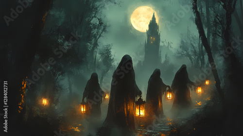The watermark will not be included on Wall mural.: A procession of hooded figures holding glowing lanterns in a misty forest under a full moon, creatin