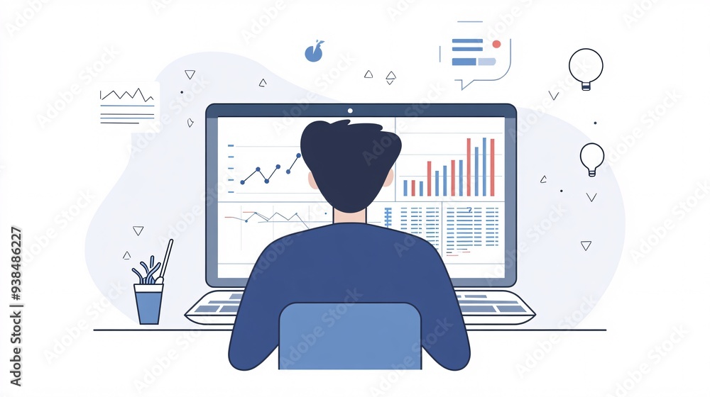 Wall mural a product manager analyzing data on a laptop with charts and graphs displayed on the screen, light s - Wall murals Wall mural a product manager analyzing data on a laptop with charts and graphs displayed on the screen, light s - Wall murals