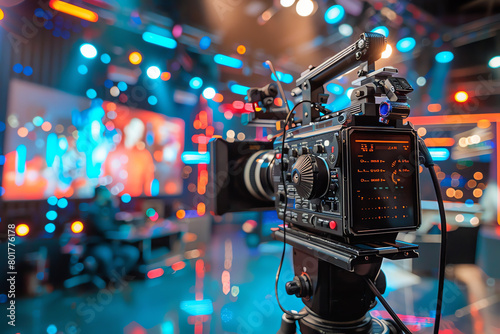 Wall mural a professional camera capturing a lively broadcast on a colorful studio set during a dynamic televis - Wall murals Wall mural a professional camera capturing a lively broadcast on a colorful studio set during a dynamic televis - Wall murals