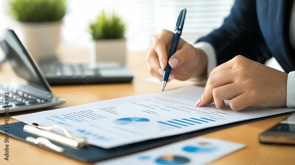 Wall mural a professional working at a desk, analyzing charts and graphs while writing notes, with a calculator