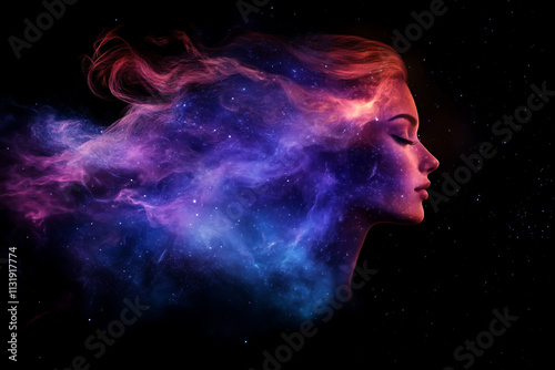 The watermark will not be included on Wall mural.: A profile view of an abstract female head with colorful nebulae creates a surreal atmosphere -