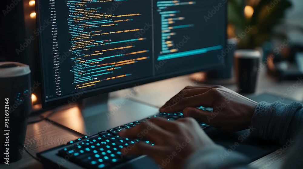 The watermark will not be included on Wall mural.: A programmer's hands typing on a backlit keyboard with a computer monitor displaying code in the bac