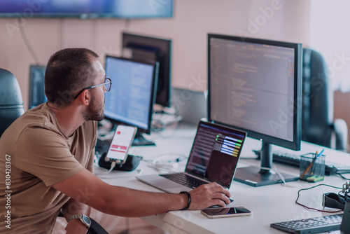 Wall mural : A programmer diligently testing smartphone applications while sitting in their office -