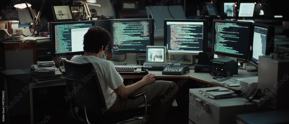 Wall mural a programmer immersed in code, backlit by four glowing monitors in a dimly lit room, capturing the e