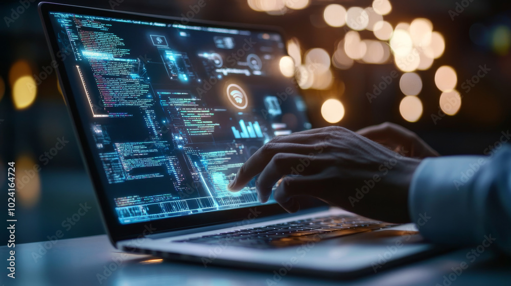 Wall mural a programmer works on a laptop, writing code and testing software.the screen shows abstract code,and - Wall murals Wall mural a programmer works on a laptop, writing code and testing software.the screen shows abstract code,and - Wall murals