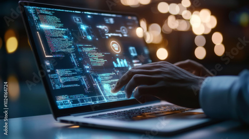 Wall mural a programmer works on a laptop, writing code and testing software.the screen shows abstract code,and