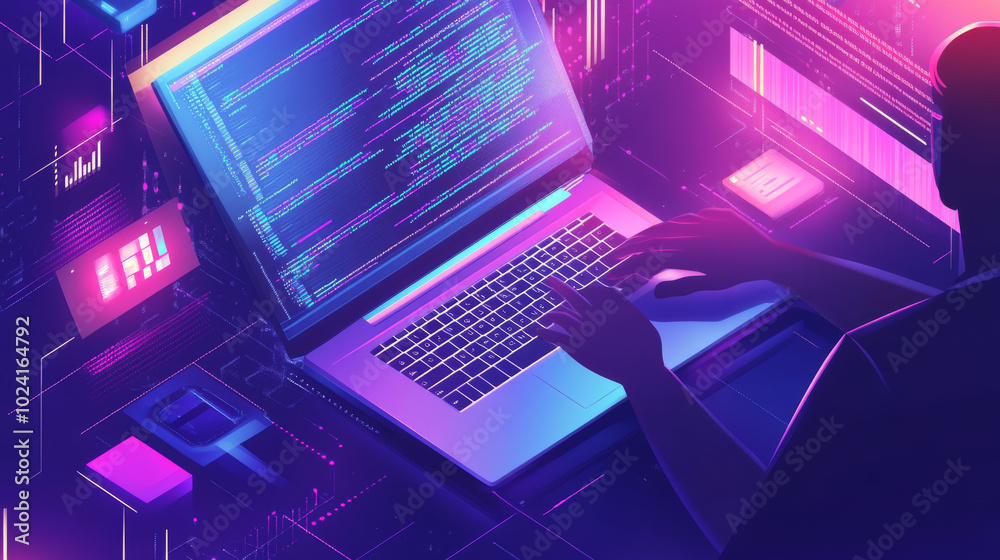 Wall mural a programmer works on a laptop, writing code and testing software.the screen shows abstract code,and - Wall murals Wall mural a programmer works on a laptop, writing code and testing software.the screen shows abstract code,and - Wall murals