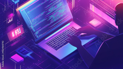 Wall mural a programmer works on a laptop, writing code and testing software.the screen shows abstract code,and