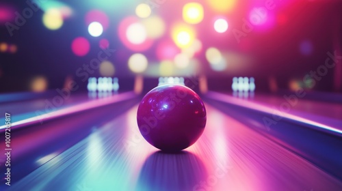Wall mural a purple bowling ball sits on the lane, ready to be rolled. the background is blurred with colorful