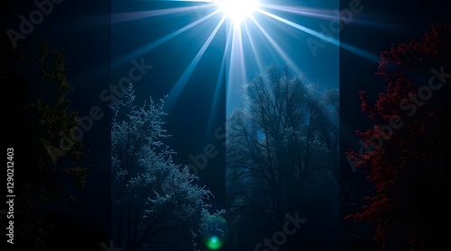 Wall mural a radiant light source illuminates a group of trees in a serene night setting, casting long beams th - Wall murals Wall mural a radiant light source illuminates a group of trees in a serene night setting, casting long beams th - Wall murals