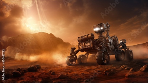 Wall mural a realistic depiction of a rover navigating the treacherous terrain of mars, with dust particles sus