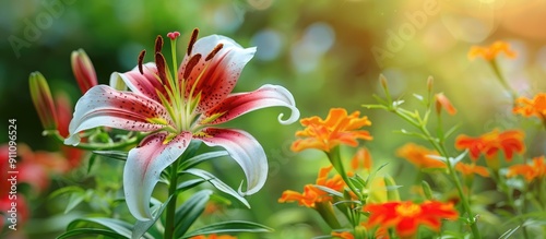 Wall mural a red and white lily blooming in a summer allotment set against a backdrop of green grass and common