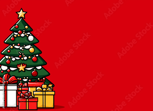Wall mural a red background with a christmas tree in the foreground. the tree is decorated with many ornaments  - Wall murals Wall mural a red background with a christmas tree in the foreground. the tree is decorated with many ornaments - Wall murals