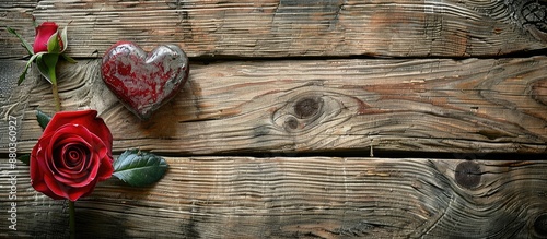 Wall mural a red rose and heart on a wooden backdrop create a romantic scene with copy space image available