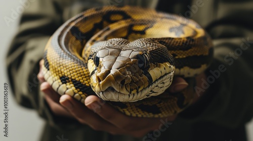 The watermark will not be included on Wall mural.: A reptile handler confidently holds a large and colorful exotic snake, showcasing its unique pattern