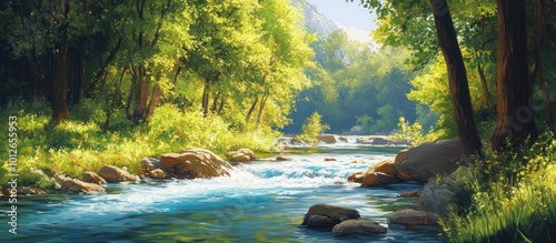 The watermark will not be included on Wall mural.: A river flows through a lush forest, sunlight streaming through the trees, creating a picturesque sc