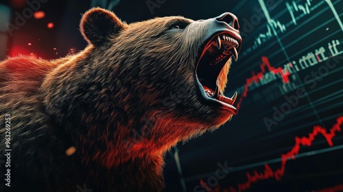 Wall mural : A roaring bear symbolizes financial market volatility against a backdrop of market graphs and data a