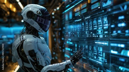 The watermark will not be included on Wall mural.: A robot is looking at a computer screen with a blue background