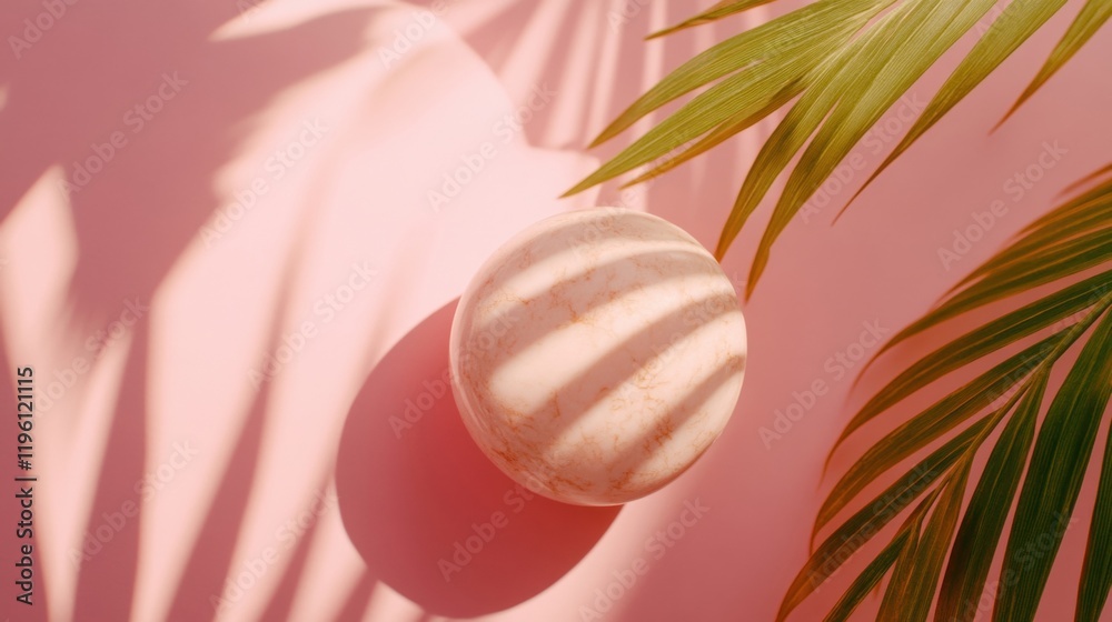 The watermark will not be included on Wall mural.: A round marble object rests on a pink surface while shadows from palm leaves create playful patterns