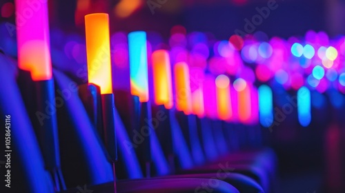 Wall mural a row of colorful lights on seats in a dark room with blurred lights in the background.