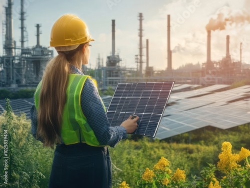 Wall mural : A scene highlighting industry engineers with eco-friendly practices, implementing energy-efficient p