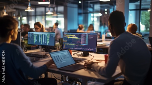 Wall mural : A scene showcasing a team of software developers coding, collaborating, and testing applications in